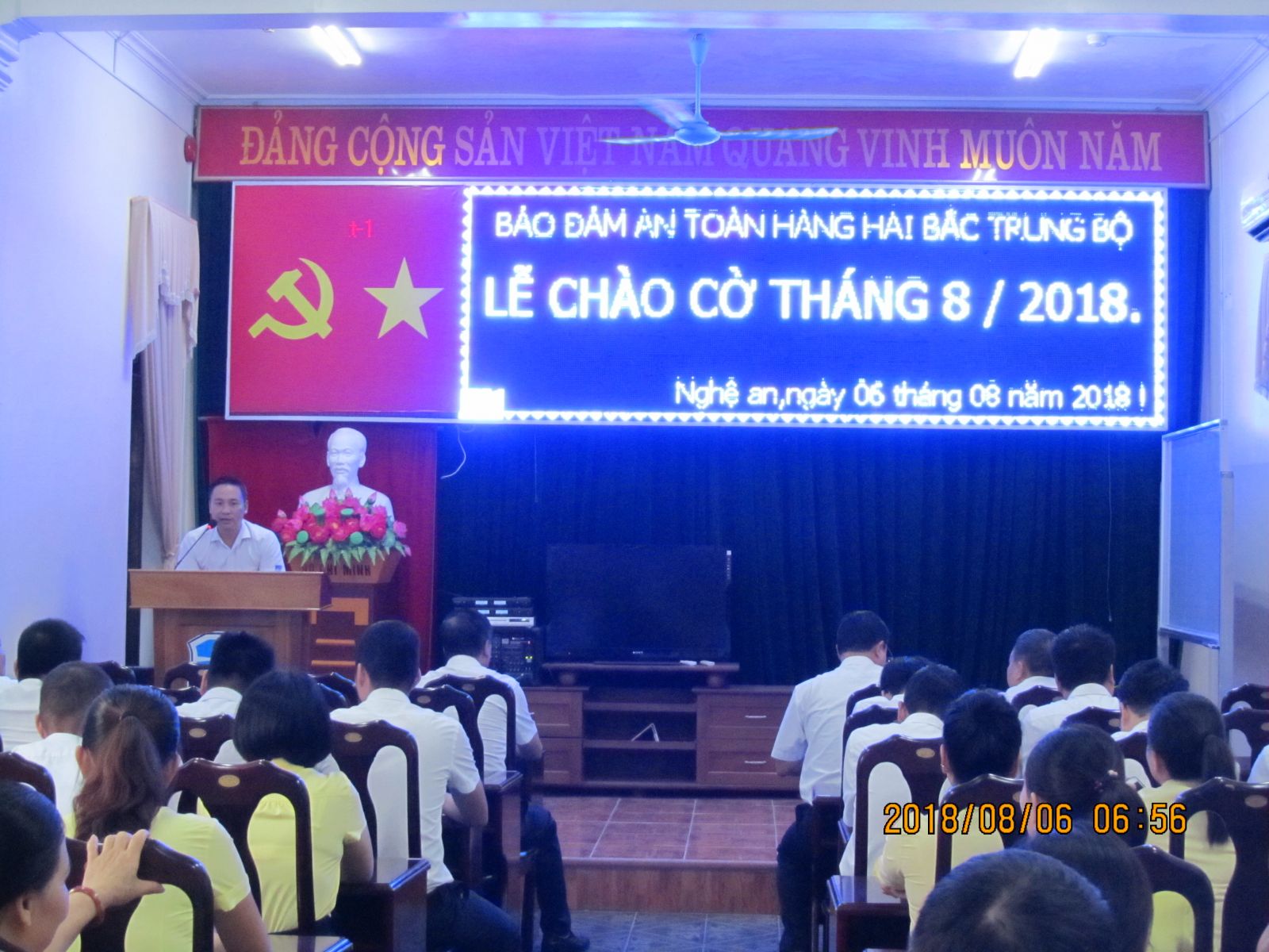 Thực hiện thông báo số 348-TB/ĐU của Ban Thường vụ Đảng ủy Tổng công ty về việc thông báo chương trình nghi Lễ Chào cờ Tổ quốc, ngày 6/8/2018, Bảo đảm an toàn hàng hải Bắc Trung Bộ đã tổ chức buổi Lễ Chào cờ đầu tháng 8 trang nghiêm cho toàn thể cán bộ, người lao động khối văn phòng tại trụ sở Bảo đảm an toàn hàng hải Bắc Trung Bộ.