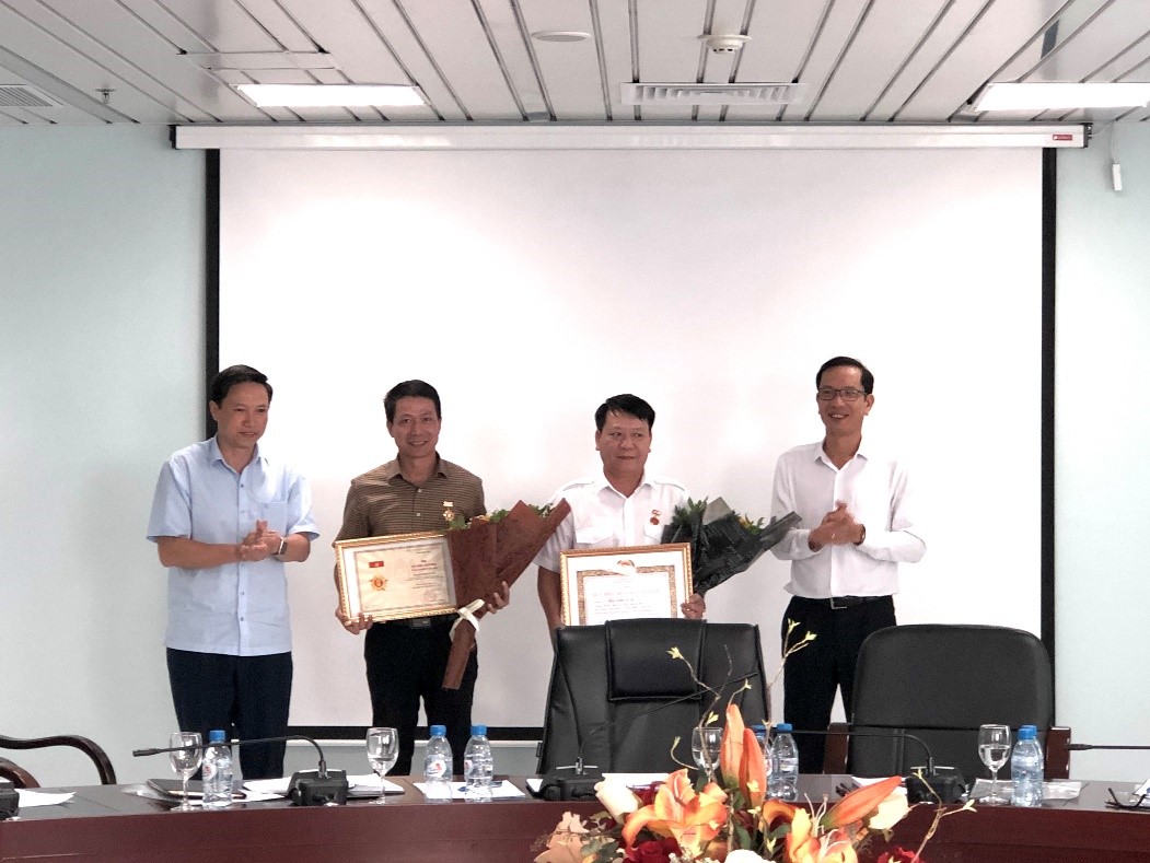 Đ/C Đặng Bá Cường - Ủy viên Ban Thường vụ Thành ủy, Trưởng Ban Nội chính Thành ủy và Đ/C Phạm Quốc Súy – Bí thư Đảng ủy Tổng công ty trao kỷ niệm chương vì sự nghiêp dân vận cho đồng chí Lê Mạnh Toàn – Phó Bí thư Thường trực Đảng ủy và huy hiệu 30 năm tuổi Đảng cho đồng chí Bùi Đức Hiệp – Giám đốc Công ty TNHH MTV Hoa tiêu khu vực II