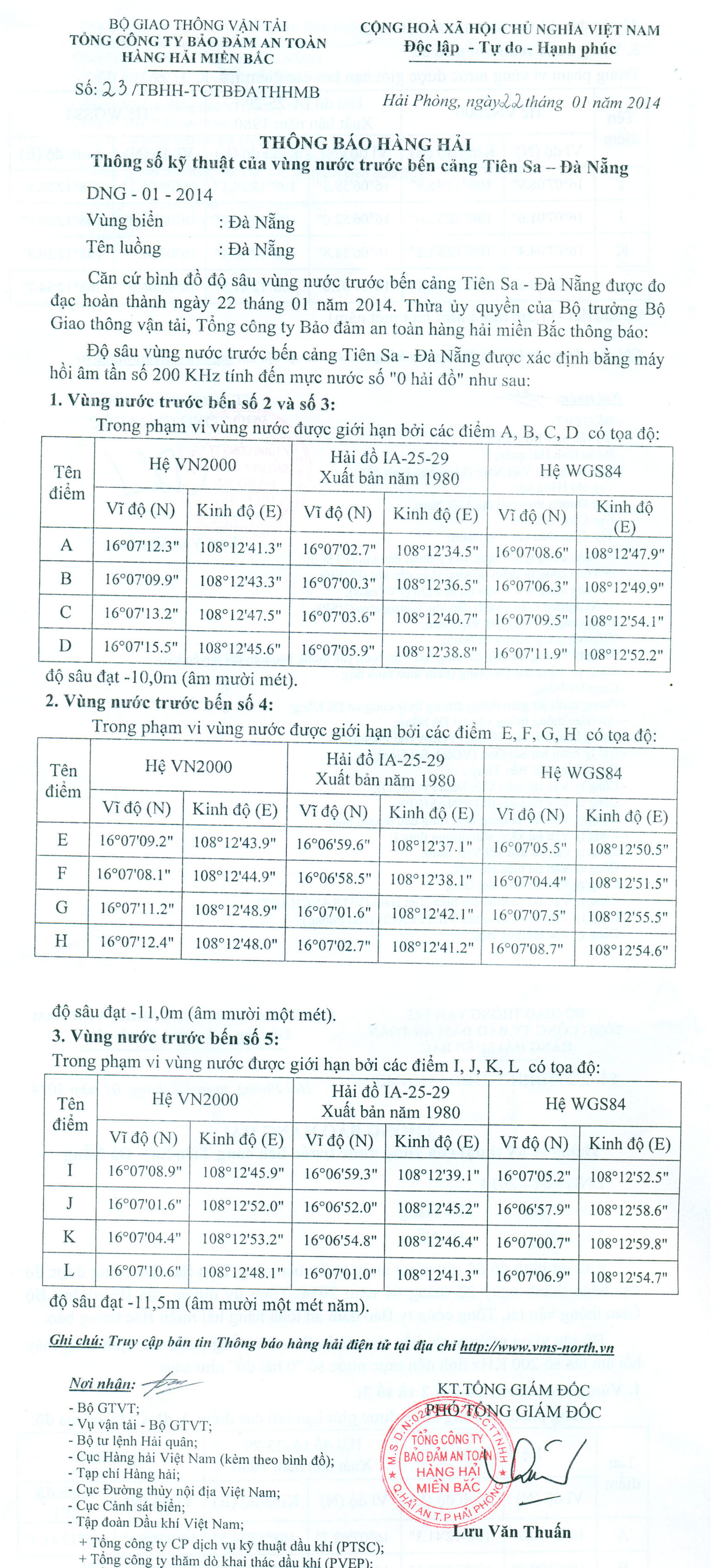 Căn cứ bình đồ độ sâu vùng nước trước bến cảng Tiên Sa - Đà Nẵng được đo đạc hoàn thành ngày 22 tháng 01 năm 2014. Thừa ủy quyền của Bộ trưởng Bộ Giao thông vận tải, Tổng công ty Bảo đảm an toàn hàng hải miền Bắc thông báo: