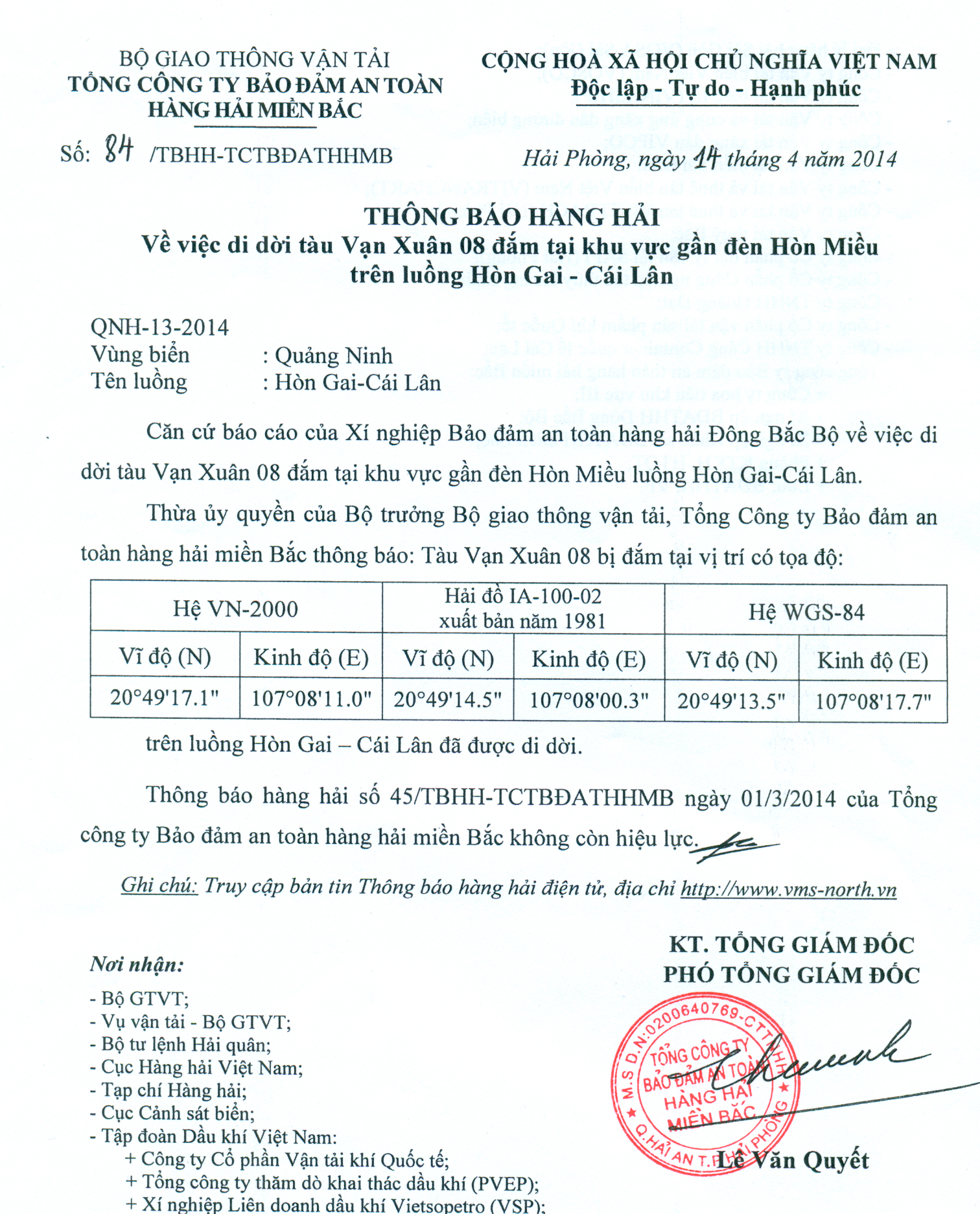 Thừa ủy quyền của Bộ trưởng Bộ giao thông vận tải, Tổng Công ty Bảo đảm an toàn hàng hải miền Bắc thông báo: Tàu Vạn Xuân 08 bị đắm tại vị trí có tọa độ: