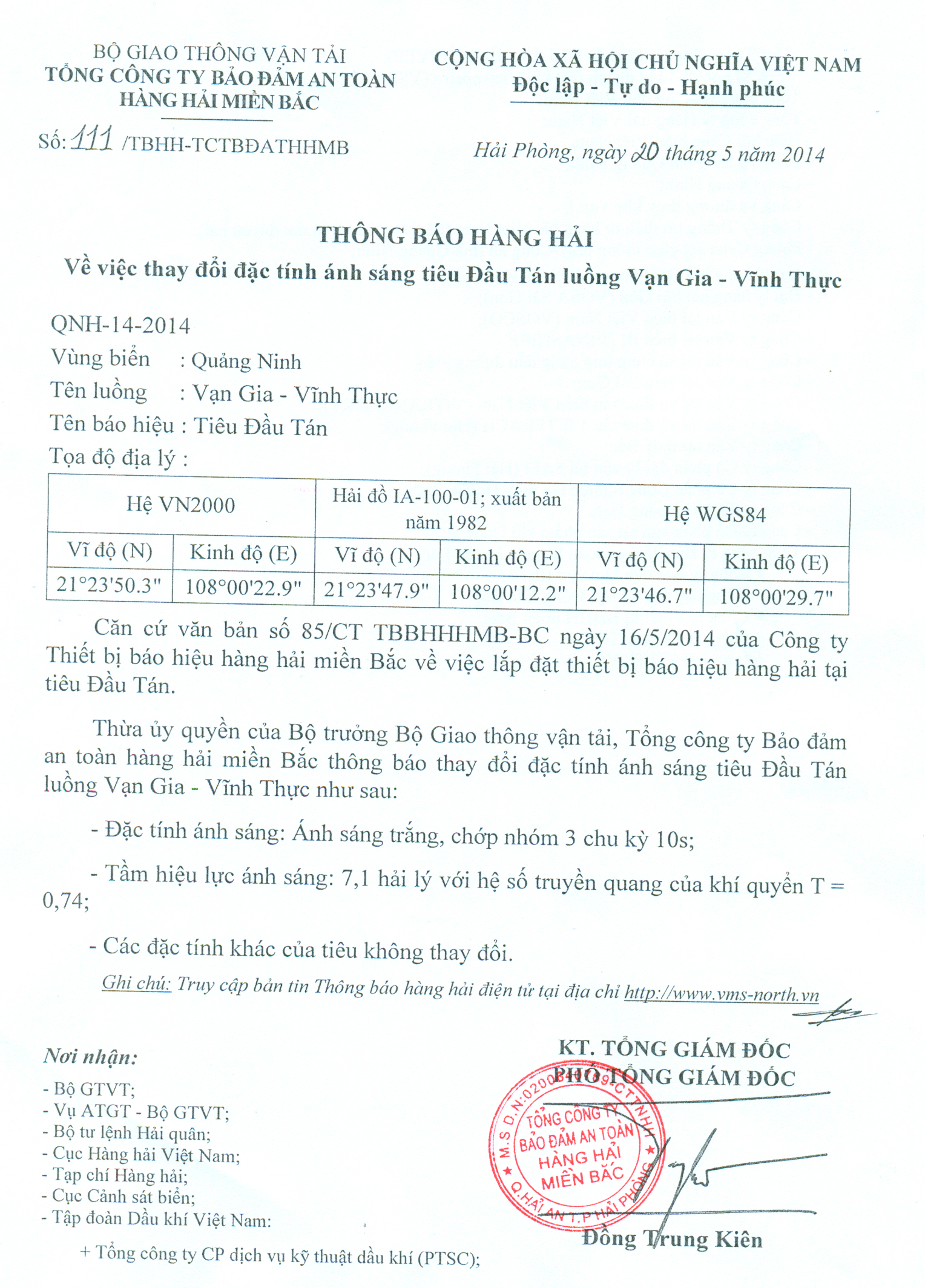 Thừa ủy quyền của Bộ trưởng Bộ Giao thông vận tải, Tổng công ty Bảo đảm an toàn hàng hải miền Bắc thông báo thay đổi đặc tính ánh sáng tiêu Đầu Tán luồng Vạn Gia - Vĩnh Thực như sau: