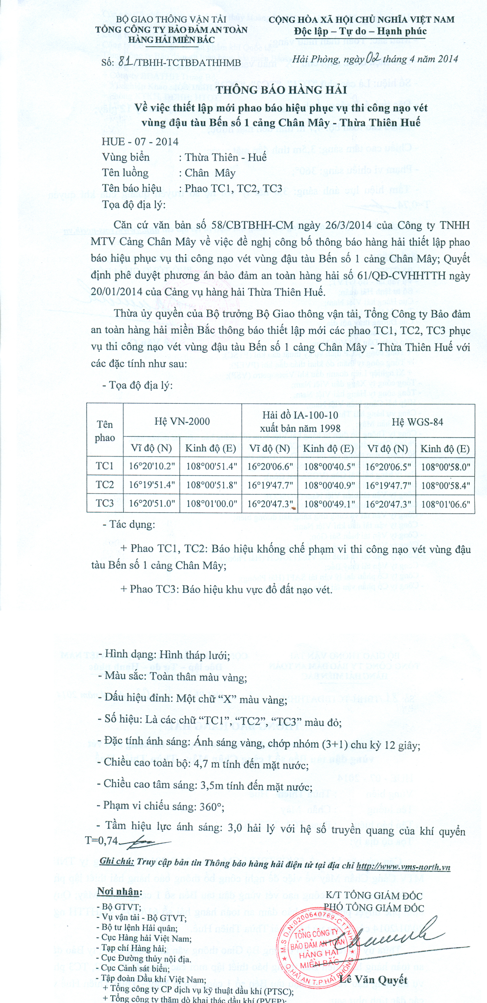 Thừa ủy quyền của Bộ trưởng Bộ Giao thông vận tải, Tổng Công ty Bảo đảm an toàn hàng hải miền Bắc thông báo thiết lập mới các phao TC1, TC2, TC3 phục vụ thi công nạo vét vùng đậu tàu Bến số 1 cảng Chân Mây - Thừa Thiên Huế với các đặc tính như sau: